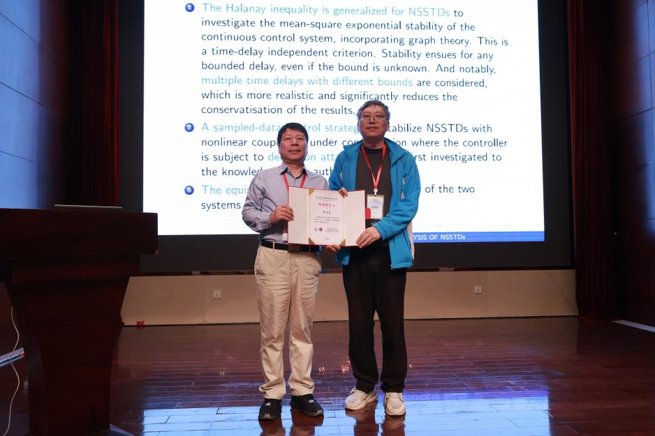 CAA会士、华南理工大学邓飞其教授则围绕“Stability Analysis of Networked Stochastic Systems with Time Delays under Deception Attacks by Sampled-Data Control”展开报告,讲述了运用采样数据控制策略,解决非线性耦合和欺骗攻击下的时滞网络随机系统(NSSTD)均方指数稳定性问题。