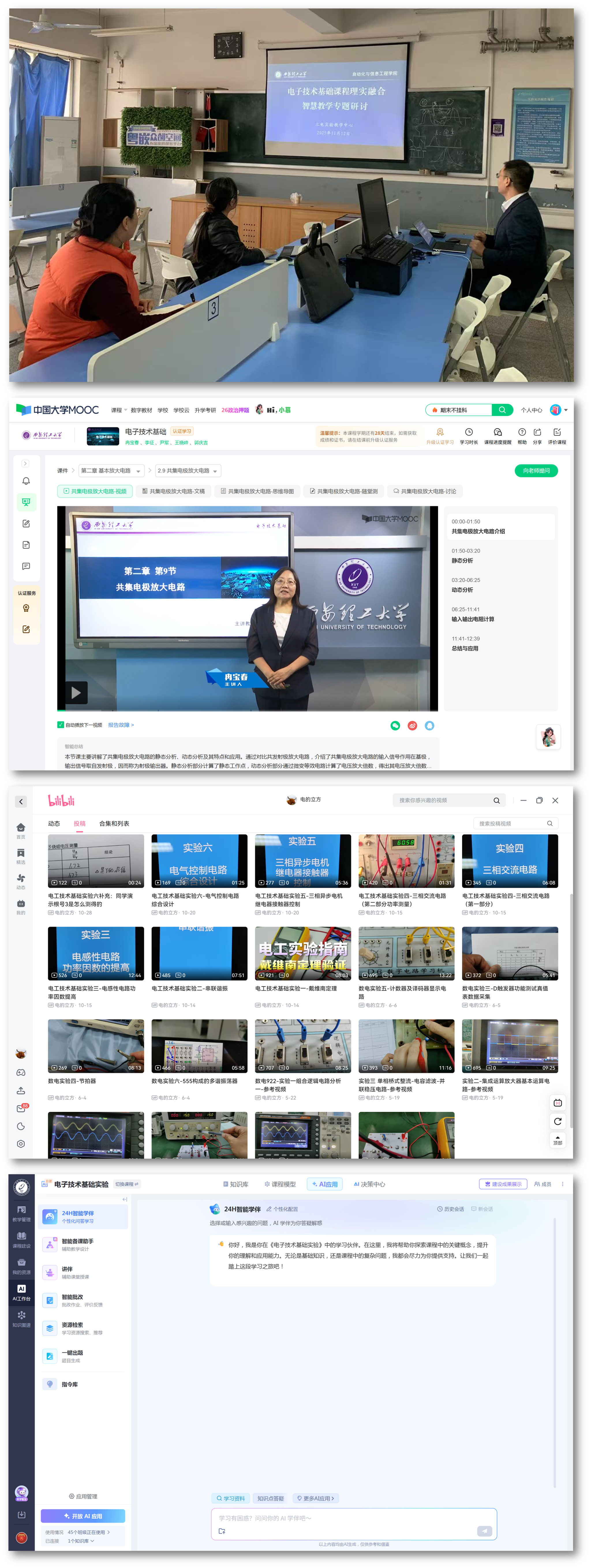 理论课与实验课教学团队聚焦教学实践中的核心问题,展开多维度、深层次的交流探讨。在实验项目优化设计环节,双方结合学生认知规律与专业培养目标,针对现有电子技术基础实验项目的难易梯度、内容关联性及实践创新性展开细致分析,提出“减少验证性实验占比、增加综合性设计实验” 的优化方向,确保实验内容与理论知识点精准对应、深度衔接;在智慧教学资源建设方面,团队围绕雨课堂平台的功能应用展开讨论,明确将理论课程中的重难点微课、实验操作指导视频、课后拓展习题等资源进行整合,实现 “理论预习 —实验操作—课后巩固”的全流程资源互通,助力学生构建系统化知识体系;针对中国大学 MOOC 课程教学视频资源融合问题,计划选取 MOOC 中优质的技术原理讲解、行业应用案例等内容,嵌入实验指导环节,并将优质实验操作视频内容融入理论课堂,弥补传统教学时空限制,丰富教学内容维度。